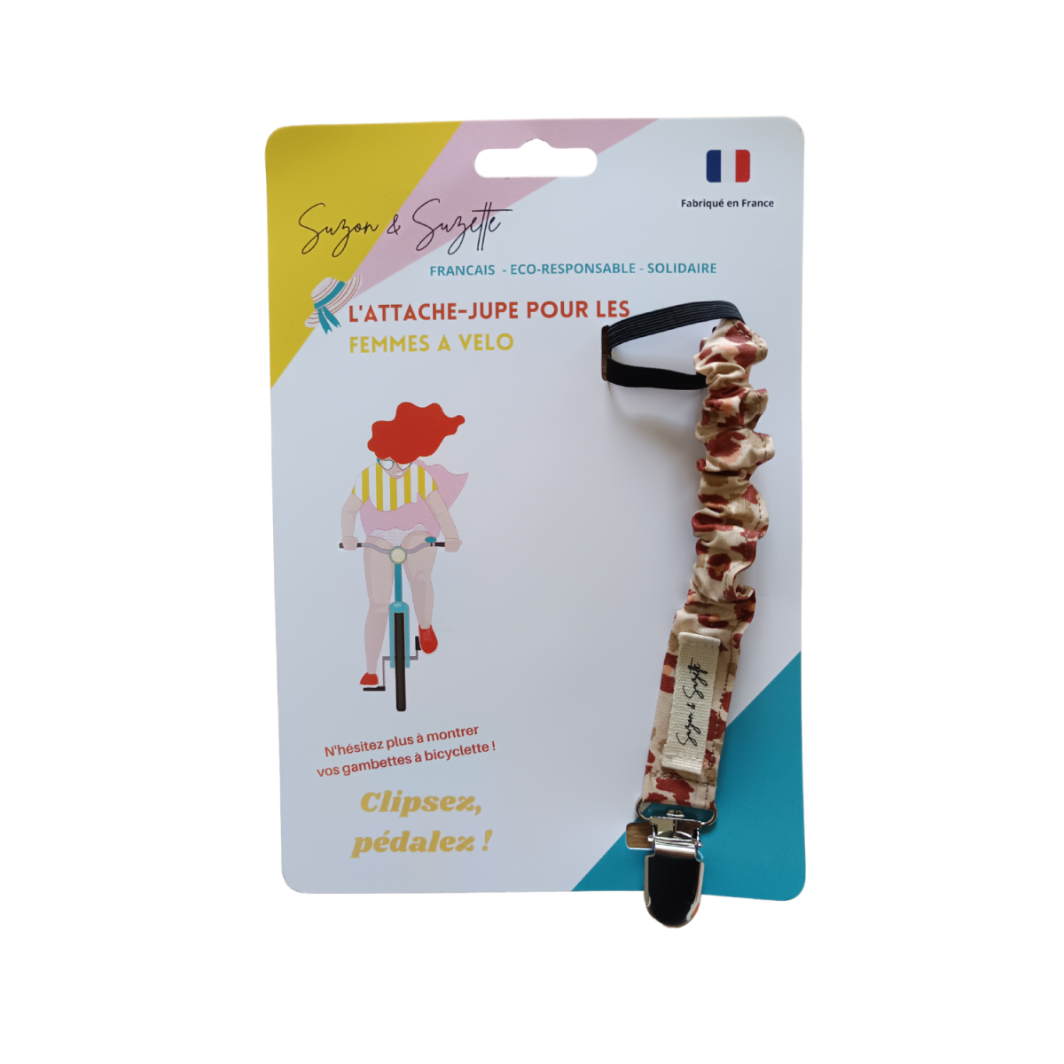 La pince pour faire du vélo en jupe Sentez-vous libre, en un tour de main, de pédaler les gambettes à l’air avec l’attache-jupette de Suzette !