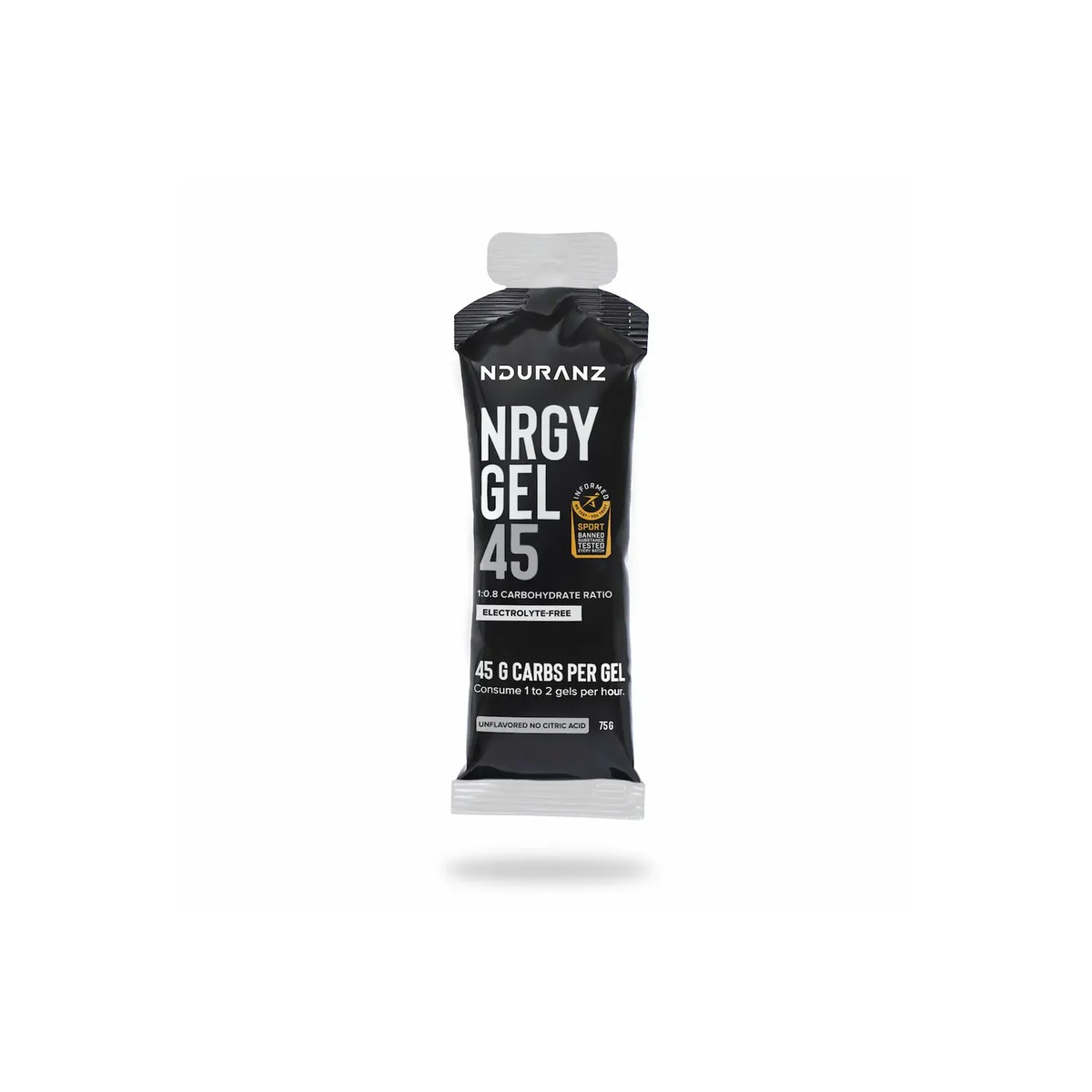 Nrgy Gel 45 (sans électrolytes) contient du glucose (sous forme de maltodextrine) et du fructose. Comme ces glucides sont absorbés via différents transporteurs dans l’intestin, leur combinaison permet à ton corps d’absorber davantage de glucides.